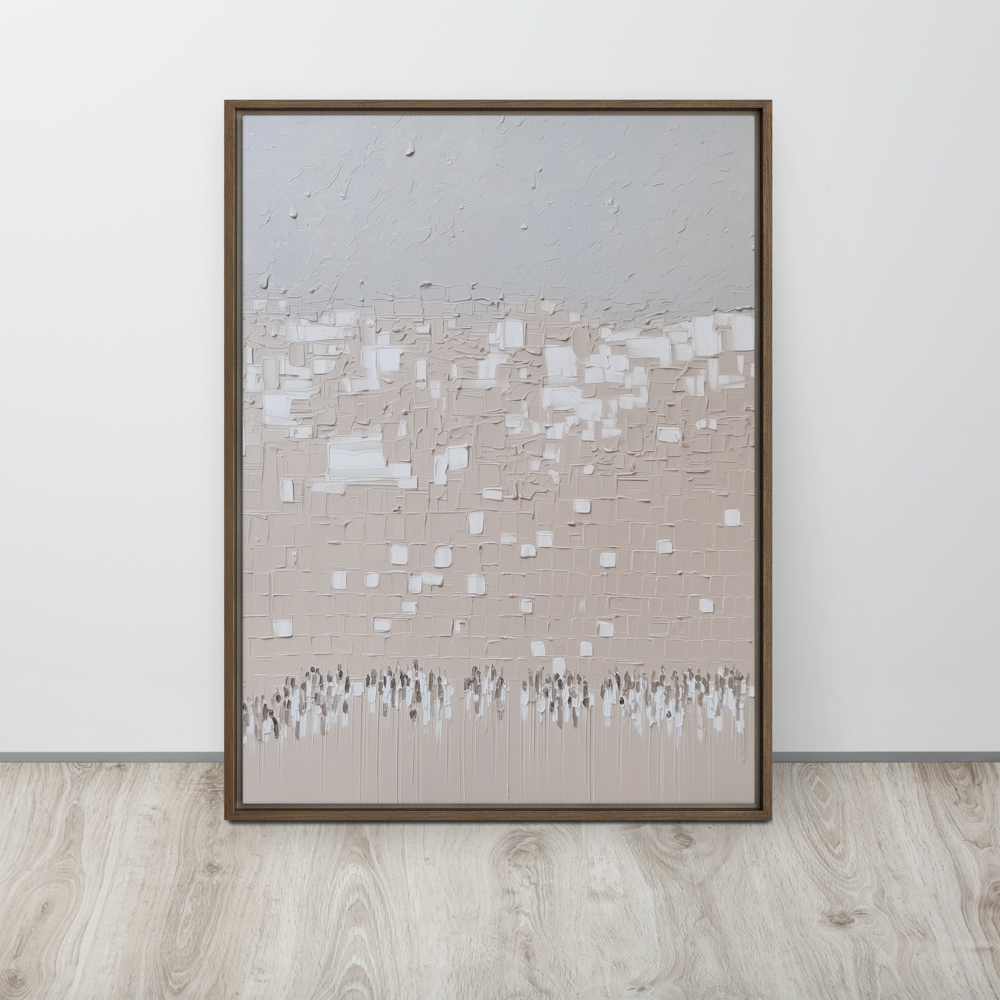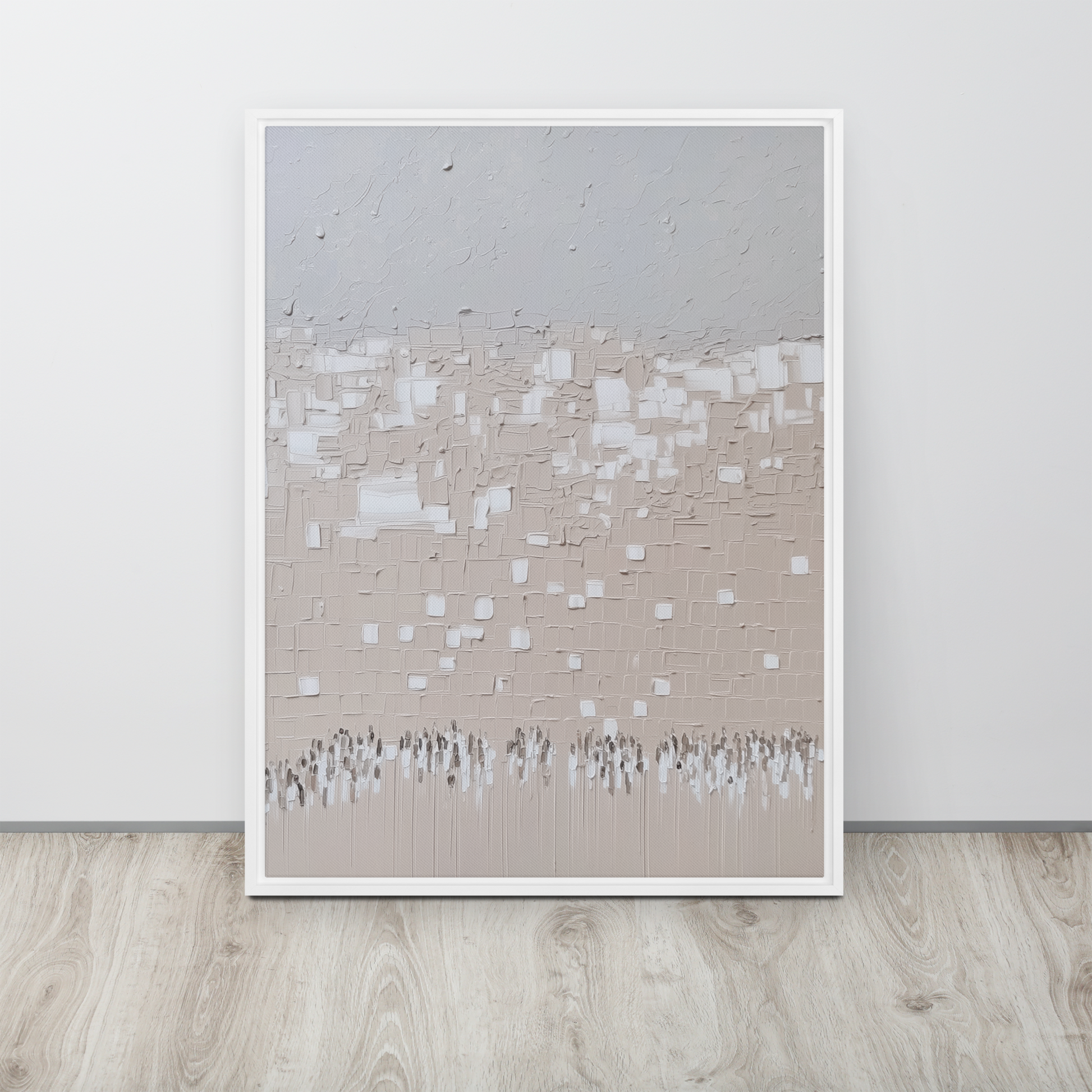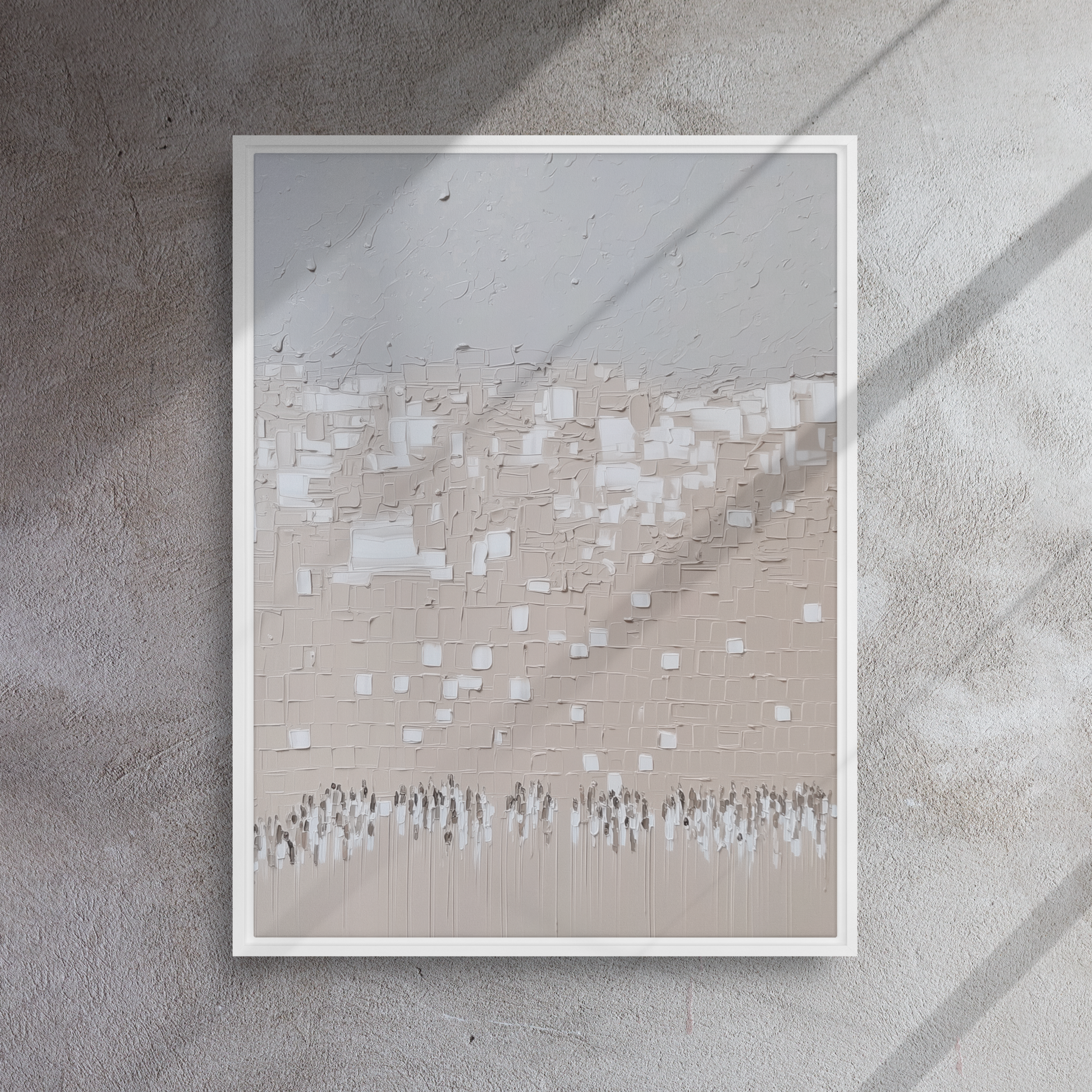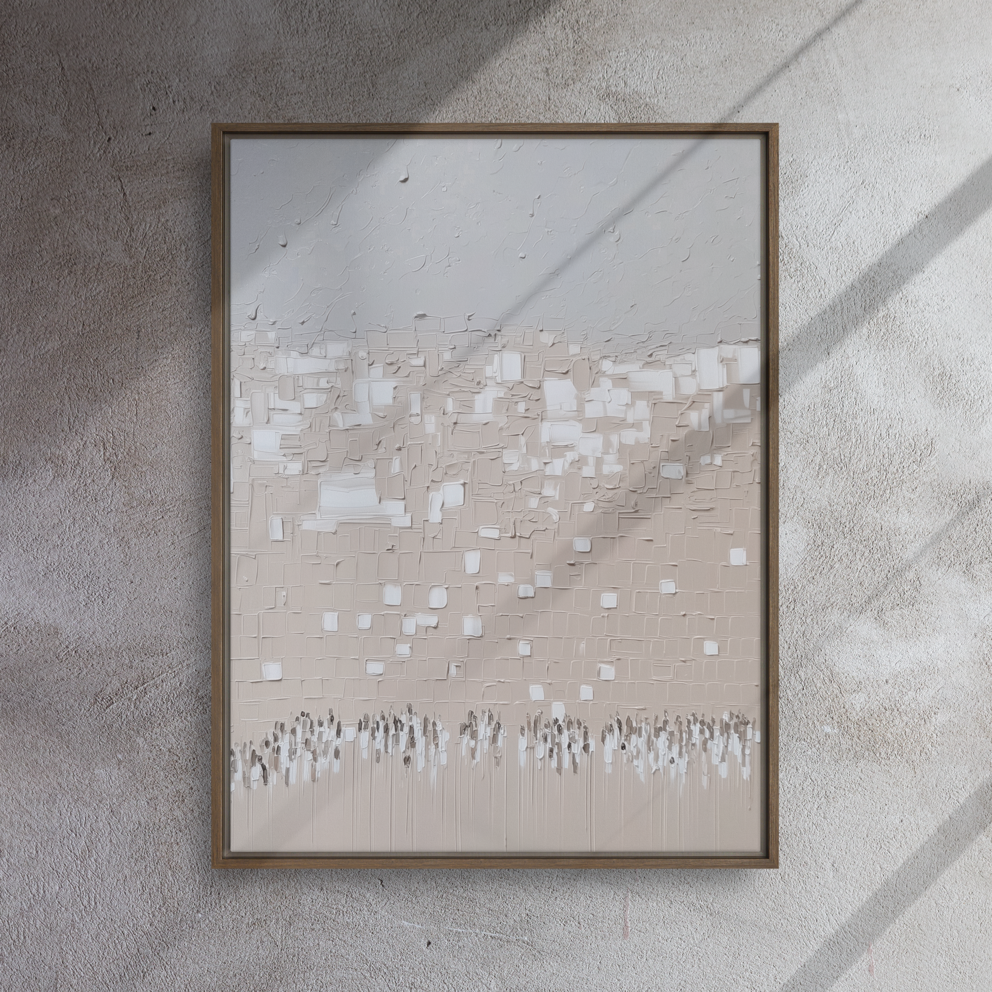 In Ascension, countless figures gather, digitally rendered in muted tones of taupe and white, their forms both distinct and unified. They stand before the ancient Wall, a dense mosaic of textured blocks that rise like accumulated centuries, like prayers pressed into stone.