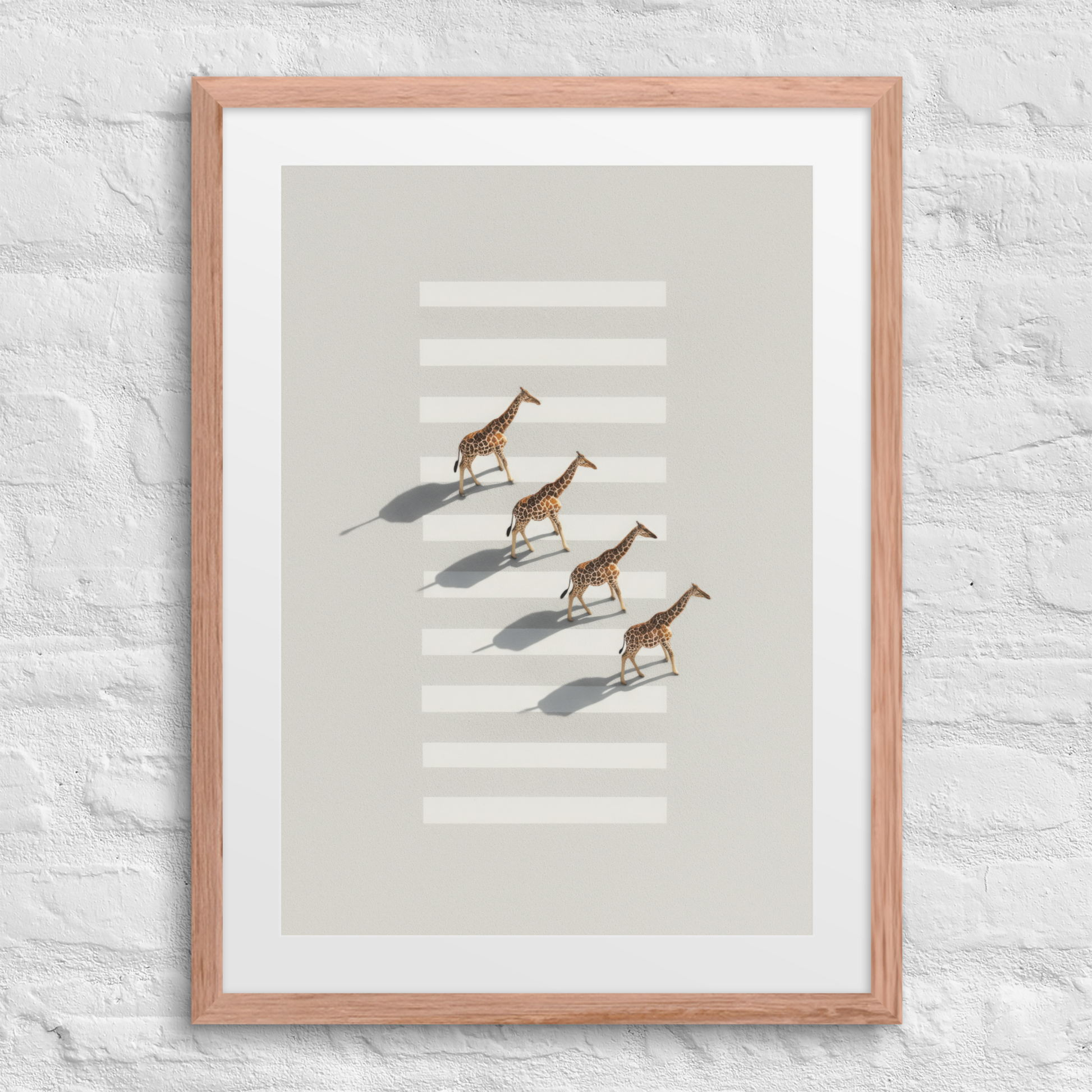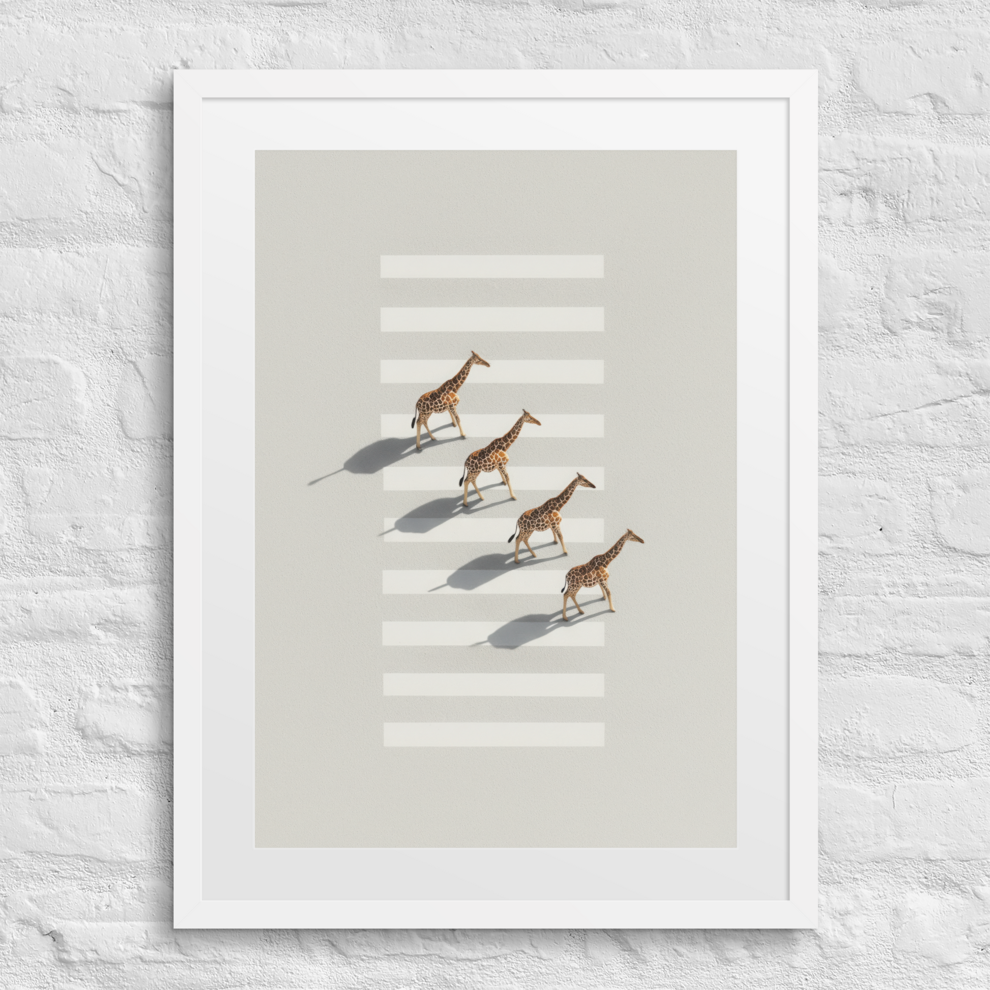 Giraffe Xing blends urban order with wild imagination. Four giraffes stride across a minimalist crosswalk, their long necks casting playful shadows against the stark white lines. The piece flips the everyday into the extraordinary — a city street becomes a safari path, and a mundane crossing becomes a moment of wonder. With humor and elegance, it asks us to notice the wild possibilities hidden in plain sight.