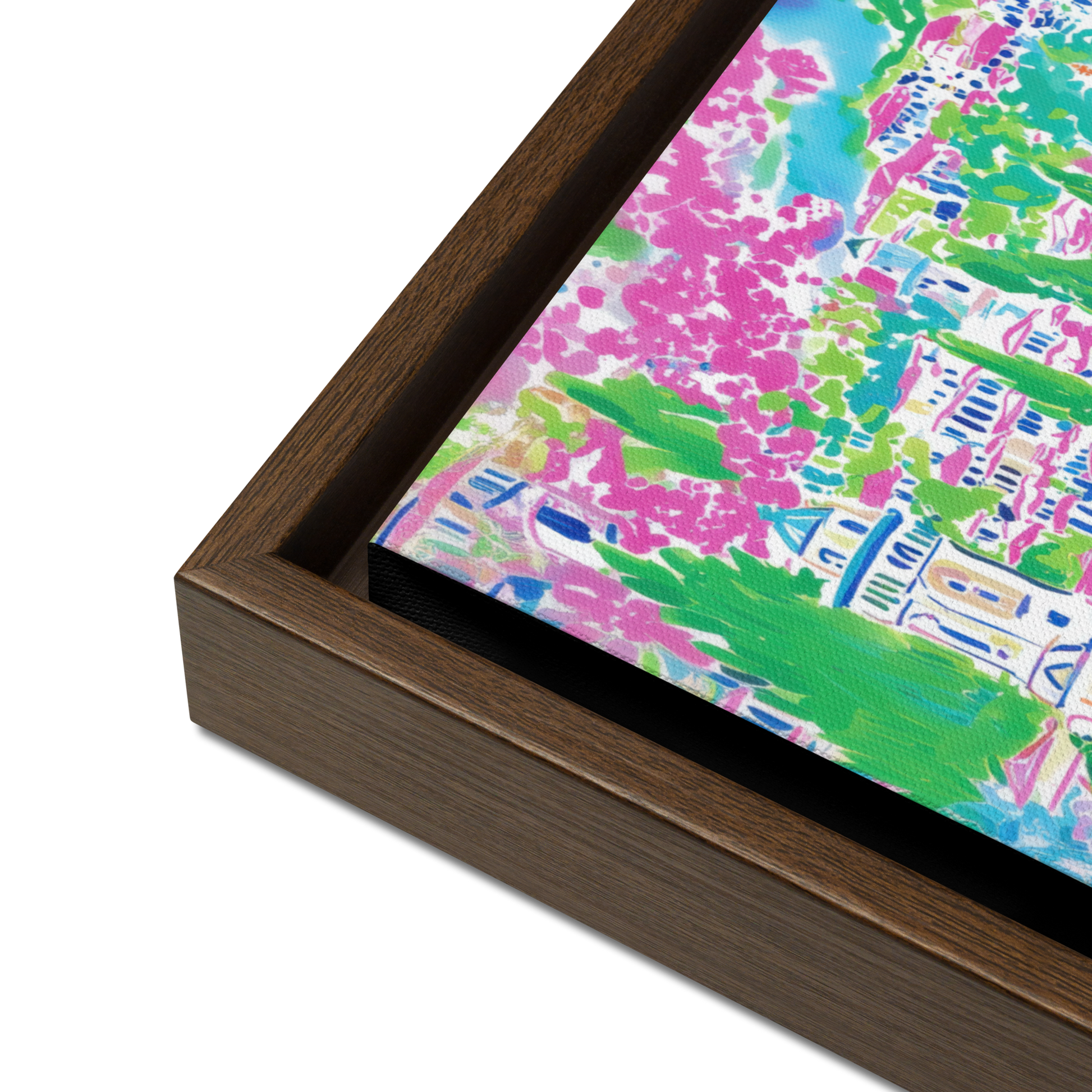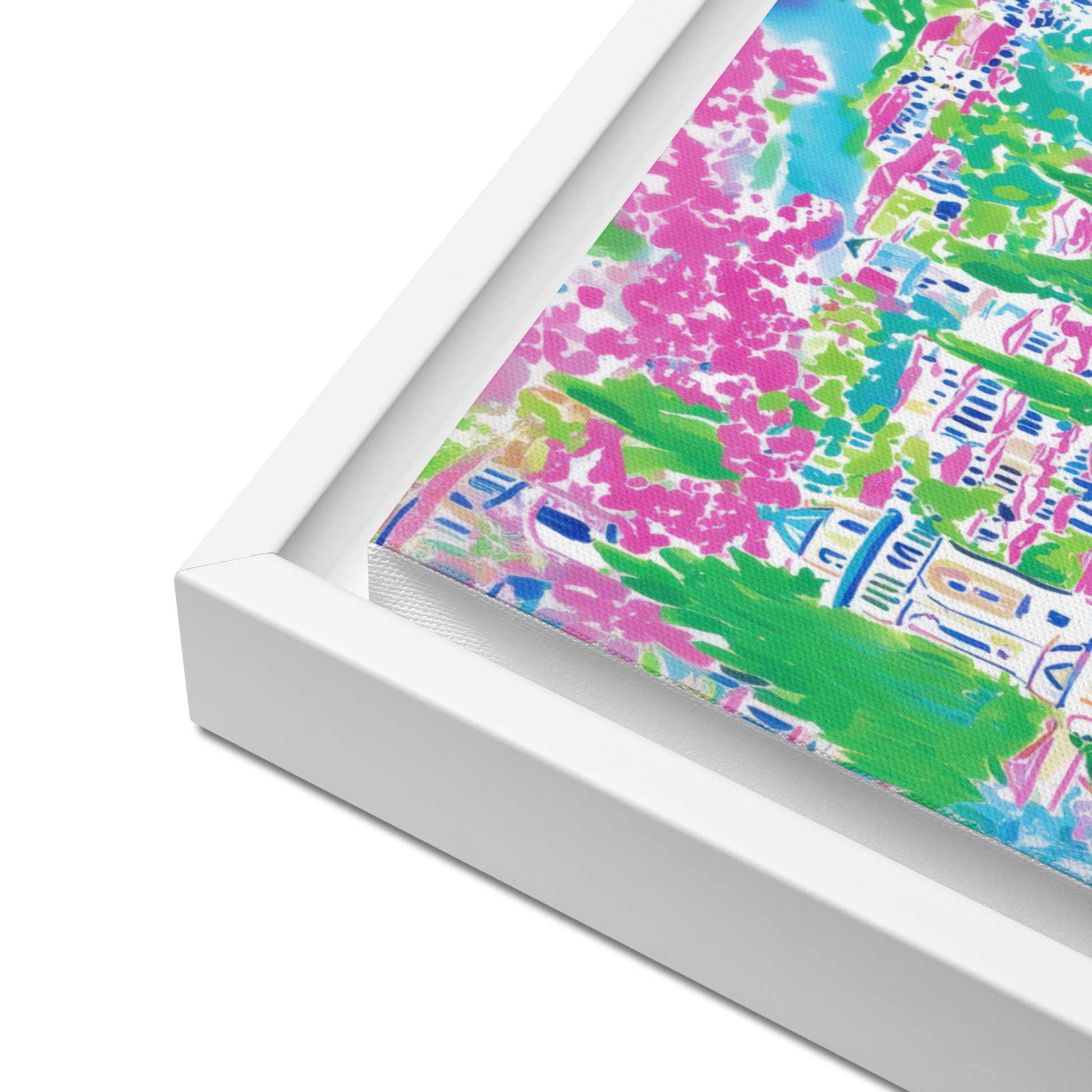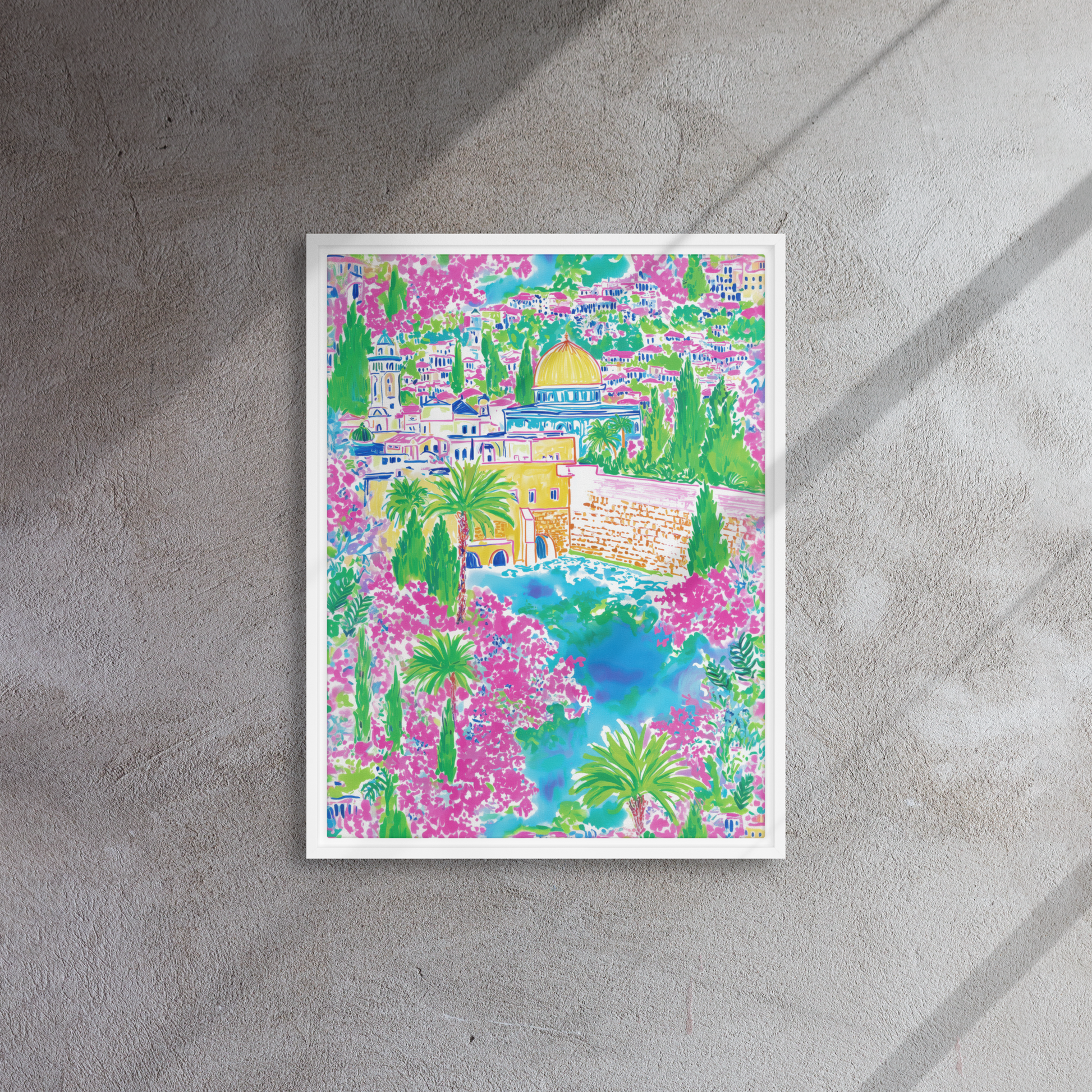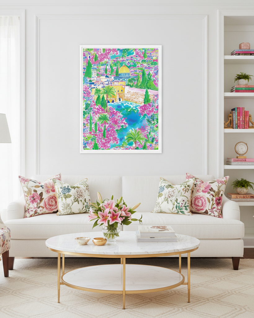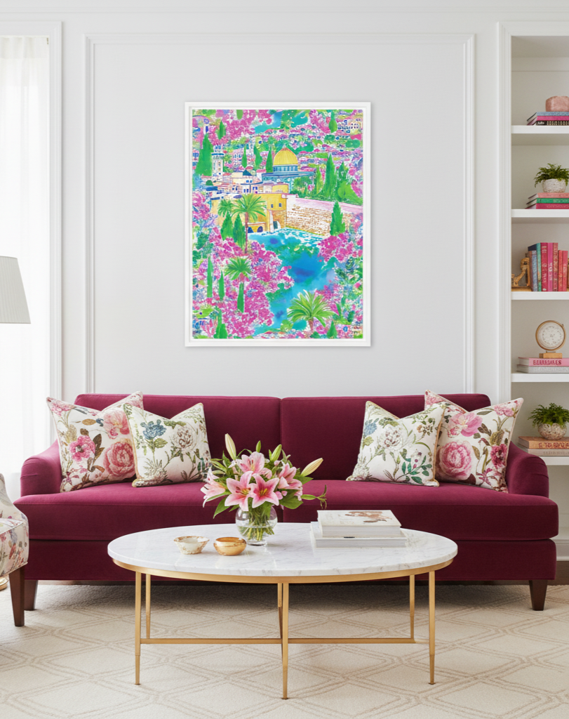 Lilly Jerusalem bursts with the joyful vibrancy of a Lilly Pulitzer–inspired palette, where bold pinks, turquoise blues, and lush greens transform the Holy City into a radiant garden. Iconic landmarks—the Western Wall, golden dome, and hillside homes—are framed by an explosion of blossoms, merging timeless stone with playful color. This piece celebrates Jerusalem not only as a city of history and faith, but as one forever alive, blooming, and full of light.