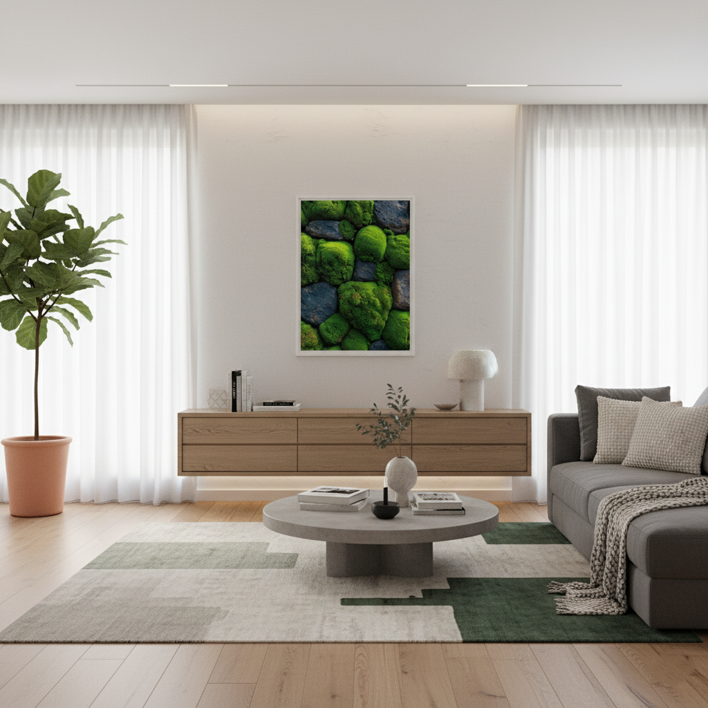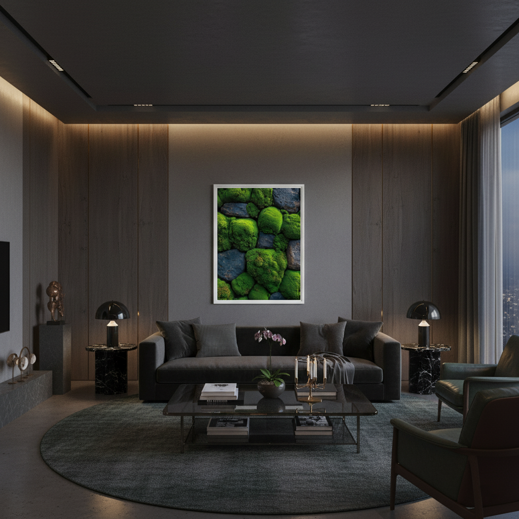 In Moss and Stone, vibrant moss colonies embrace weathered stones in this captivating overhead view. Brilliant lime-green and emerald moss covers rounded stones in various stages of growth. The moss displays rich texture variations, from dense, bubble-like clusters to fine, delicate formations that follow the natural contours of each rock.