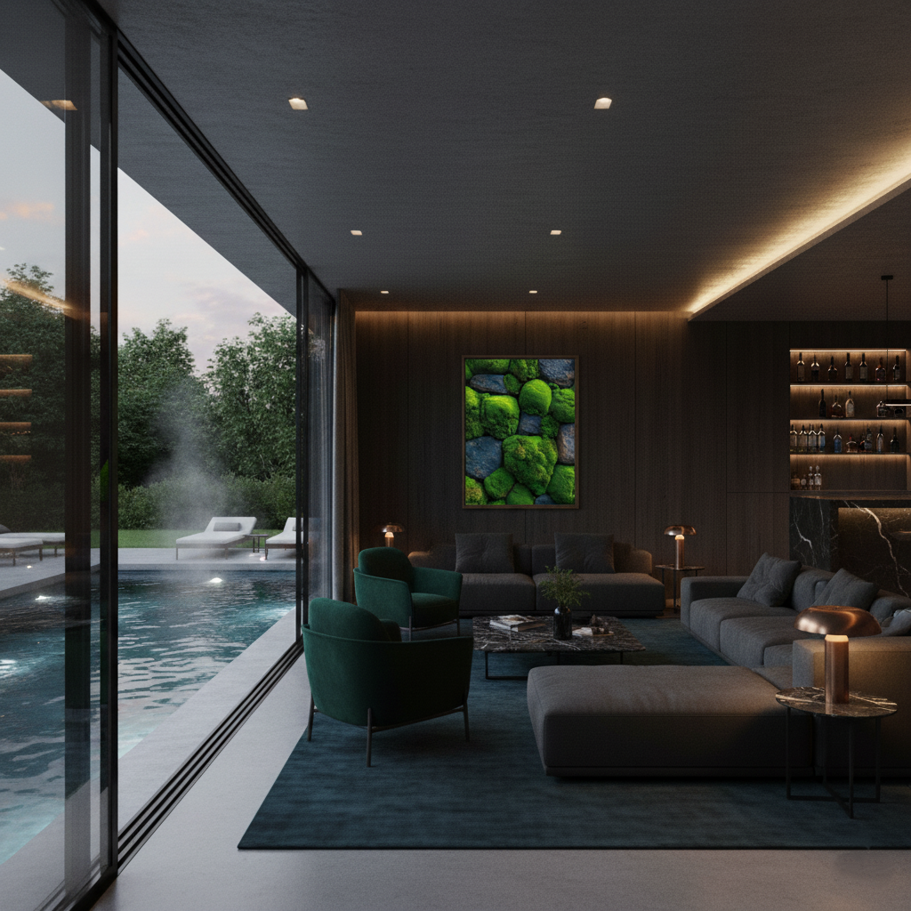 The aerial perspective reveals a striking contrast between the lush greens and smooth, charcoal-toned stones. Subtle hints of rust-orange and brown appear where moss ages or transitions, adding warmth to the cool palette. This intimate view captures nature's quiet transformation- life slowly reclaiming stone, softness embracing hardness, creating a timeless meditation on growth and resilience.