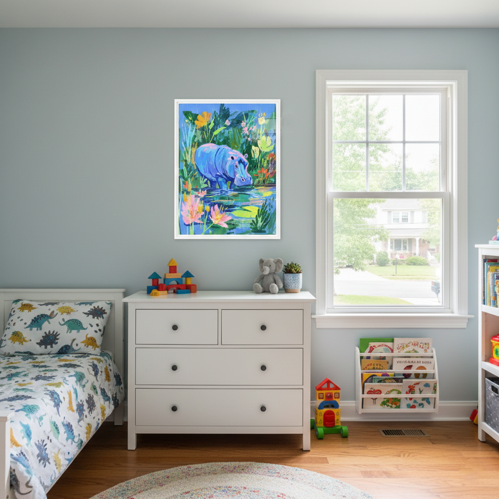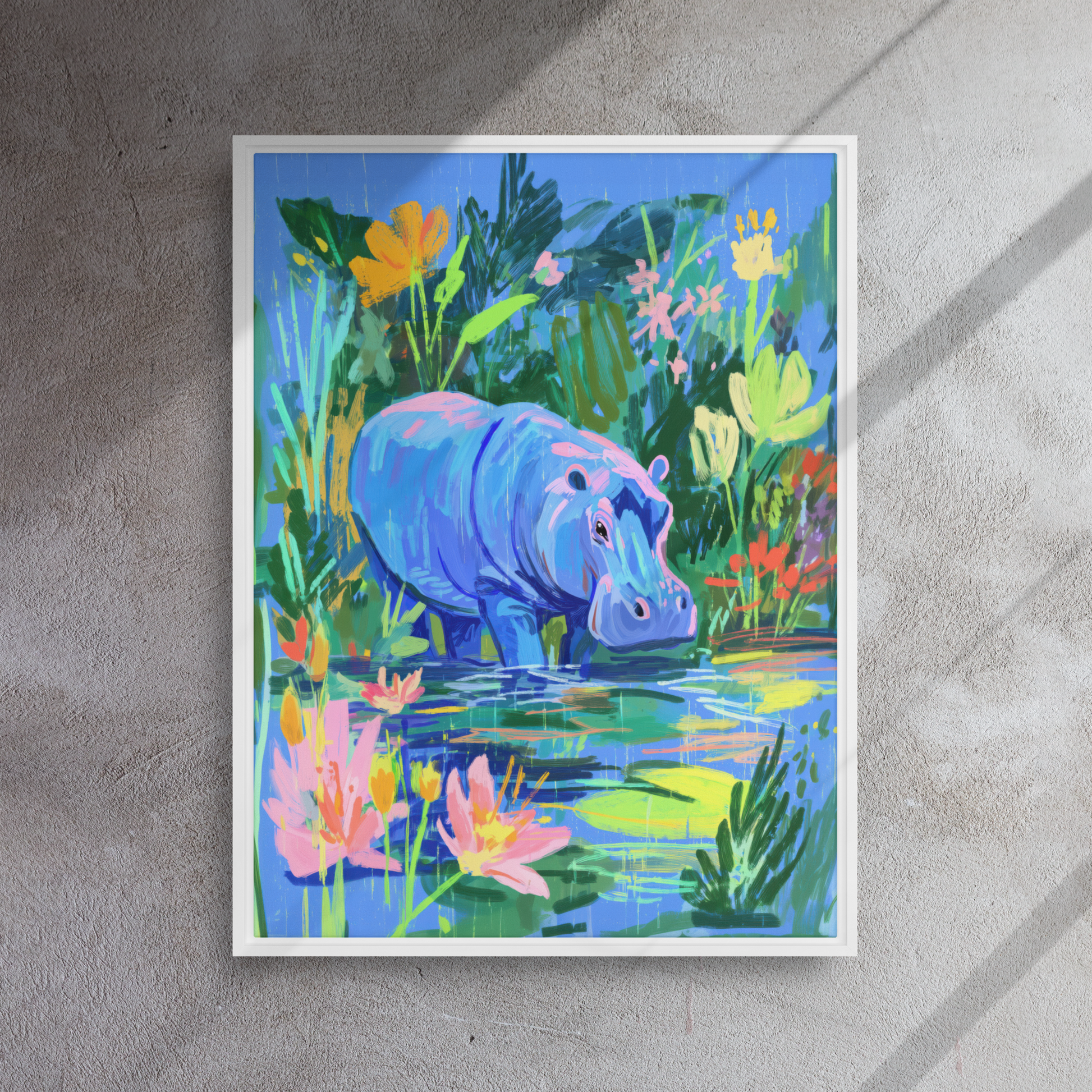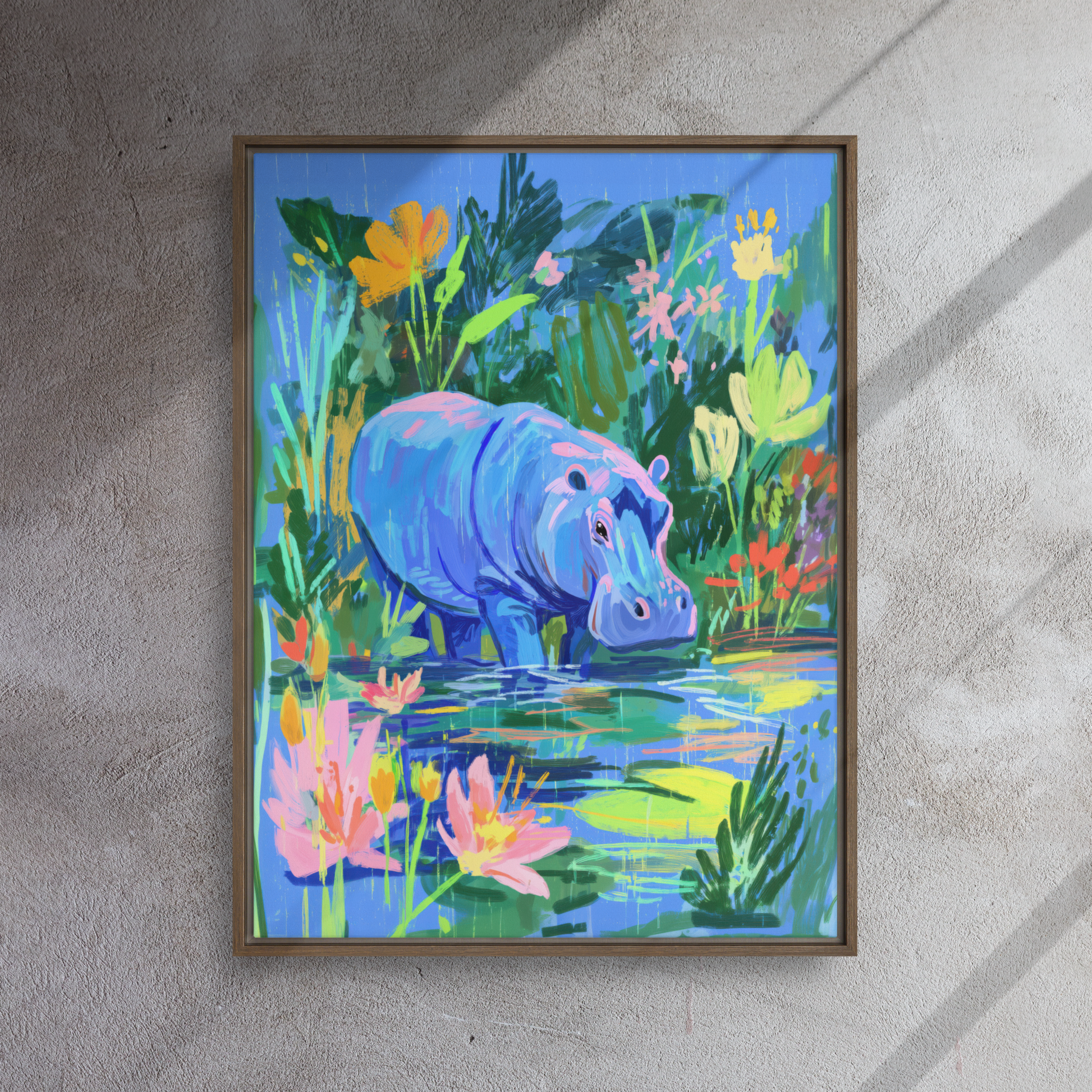 This piece captures the harmony between creature and habitat, a hidden sanctuary where nature flourishes in perfect balance. The hippo's serene expression and the abundance of flora create a sense of paradise found, inviting viewers into a world of color and tranquility. Perfect for bringing vibrancy, peace, and a touch of whimsy to any space, this artwork celebrates the beauty of the natural world in its most joyful form.